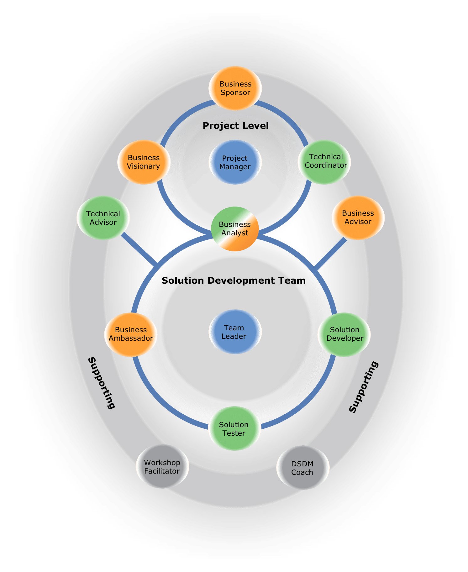 Business Advisors, Technical Advisors, Workshop Facilitator og DSDM Coach går alle sammen ind under kategorien ”Supporting Roles”, hvilket betyder, at de står klar til at guide og assistere undervejs i projektet. Alt efter behov kan der være flere Business- og Technical Advisors. Disse roller kan ikke tage beslutningerne i forbindelse med projektet, da beslutningstagningen er forbeholdt Solution Development Teamet. Til gengæld kan de rådgive projektdeltagerne med deres ekspertise inden for de to fagområder.